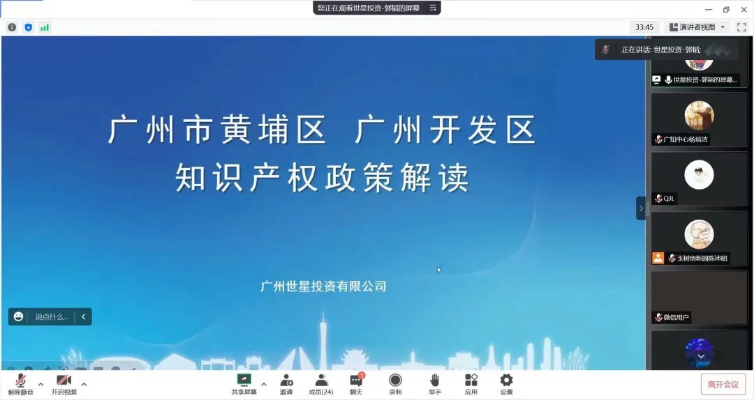 为贯彻落实党的二十大精神,深入实施创新驱动发展战略、知识产权强国战略,充分发挥知识产权激励创新的重要支撑作用,按照《知识产权质押融资入园惠企行动方案(2021-2023年)》《广东省促进专利转化助力中小企业创新发展实施方案(2021—2023年)》等相关文件要求,11月24日,广州世星投资公司联合广州知识产权交易中心、玉树创新园等单位,组织开展第九期“知融汇”知识产权质押融资银企对接会线上专场活动,区内30余名企业代表参会。