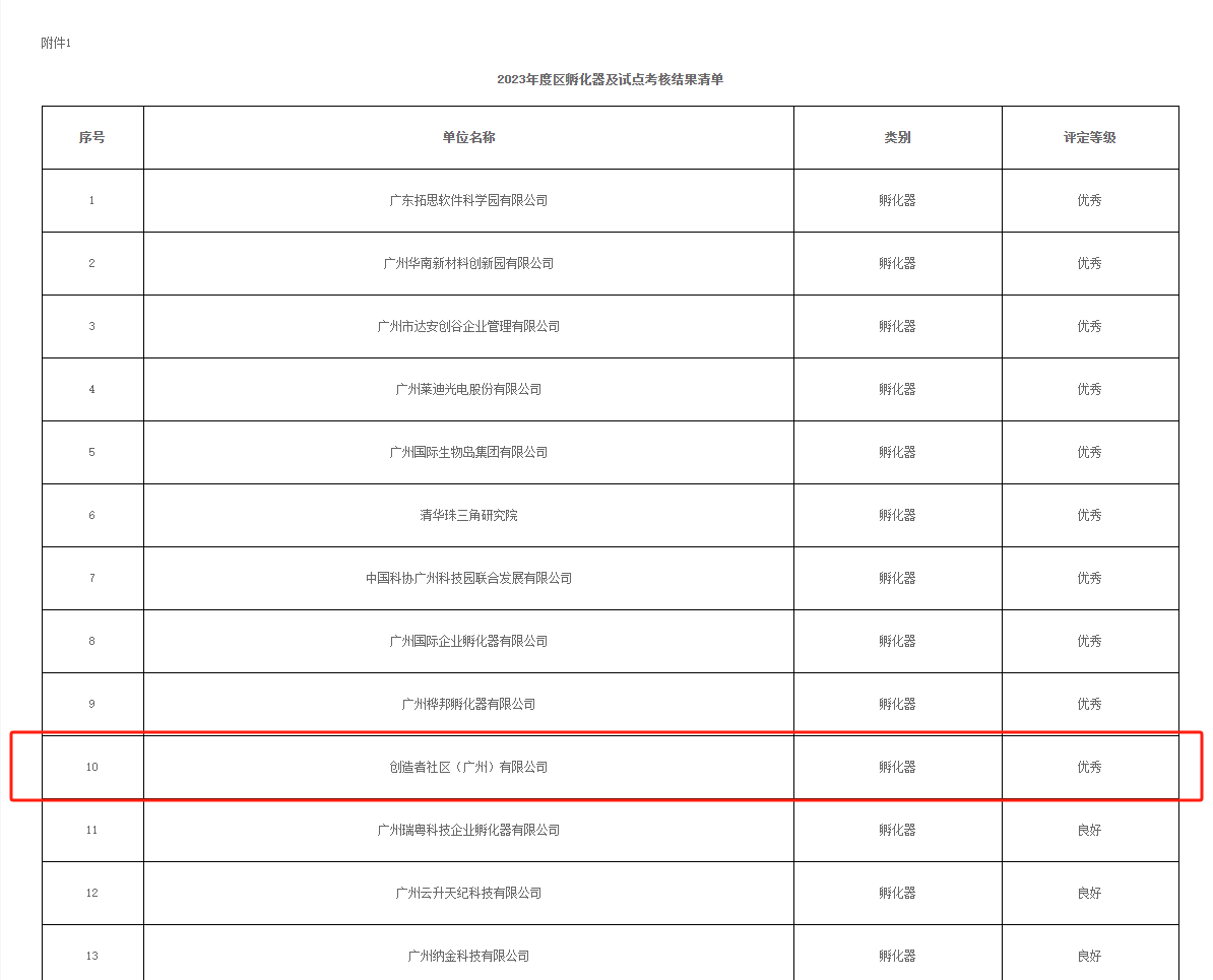 2024年8月30日,广州开发区科技创新局发布了《关于2023年度广州开发区 广州市黄埔区科技企业孵化器及试点、创客空间及试点考核结果的公示》,广州开发区产业基金投资集团下属创造者园区孵化器评定等级为优秀!